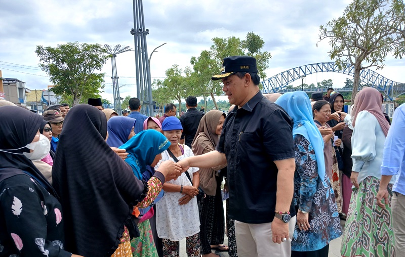 Dalam kesempatan ini, Bupati secara simbolis menyerahkan paket sembako kepada masyarakat, menegaskan peran pemerintah daerah dalam meringankan kebutuhan pokok warga, terutama menjelang bulan suci Ramadan.